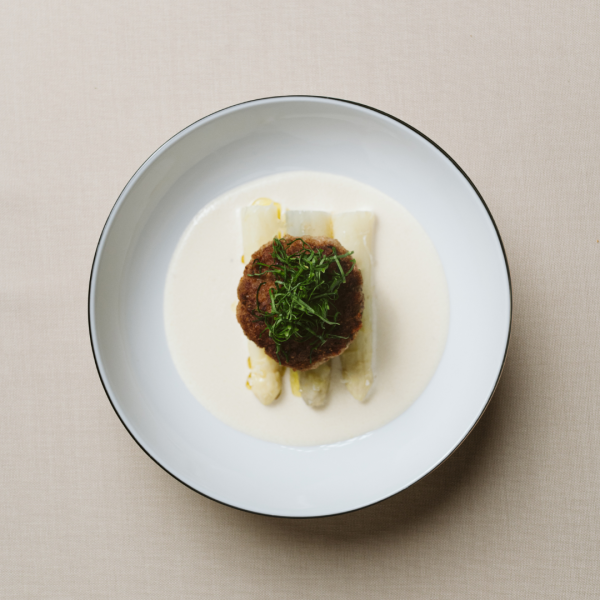 Kotleciki z wieprzowiny puławskiej mielone z czosnkiem niedźwiedzim i cielęciną z velouté szparagowym